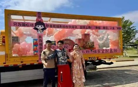 现场一辆满载气球和烟花的小货车格外引人注目,车身上写着:“恭喜肥娟夫妇合伙成功,甜蜜上市!‘幸福’爆仓,人生‘躺赢’”。这份特别的贺礼来自网友王小焗。他告诉记者,自己被“肥娟”夫妇的真诚打动,特地清空了烟花店的仓库,备齐了白天、夜晚都能放的烟花和鞭炮,“装了一车,满满的爱。”